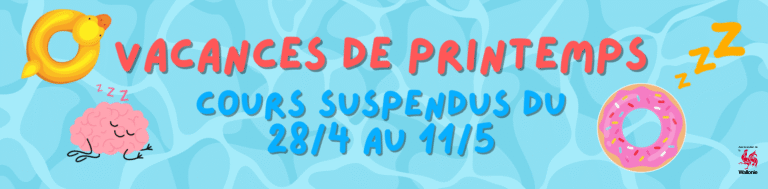 L’école de natation sera fermée du lundi 28 avril au dimanche 11 mai inclus pour les vacances.Les cours reprendront normalement à partir du lundi 12 mai. Bonnes